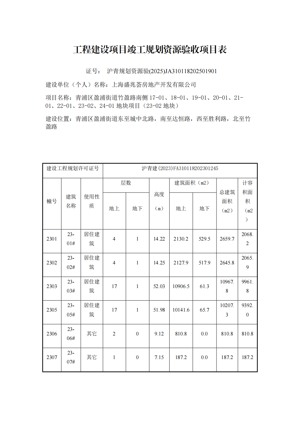 沪青规划资源验(2025)JA310118202501901上海市工程建设项目竣工规划资源验收合格证(上海盛兆荟房地产开发有限公司)