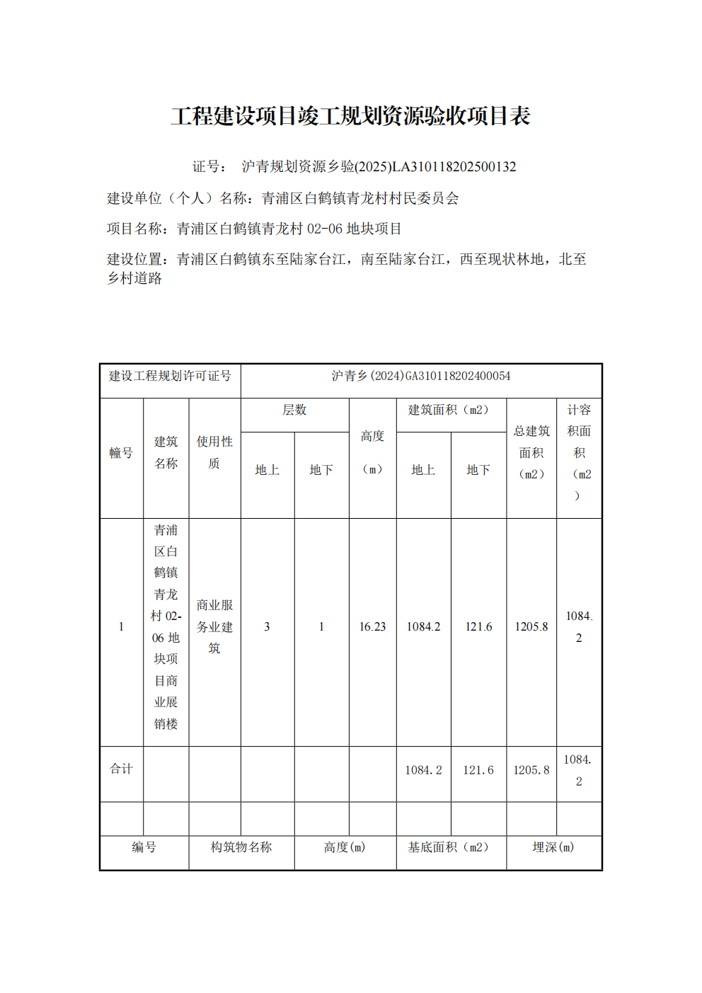沪青规划资源乡验 (2025)LA310118202500132上海市工程建设项目竣工规划资源验收合格证(青浦区白鹤镇青龙村村民委员会)