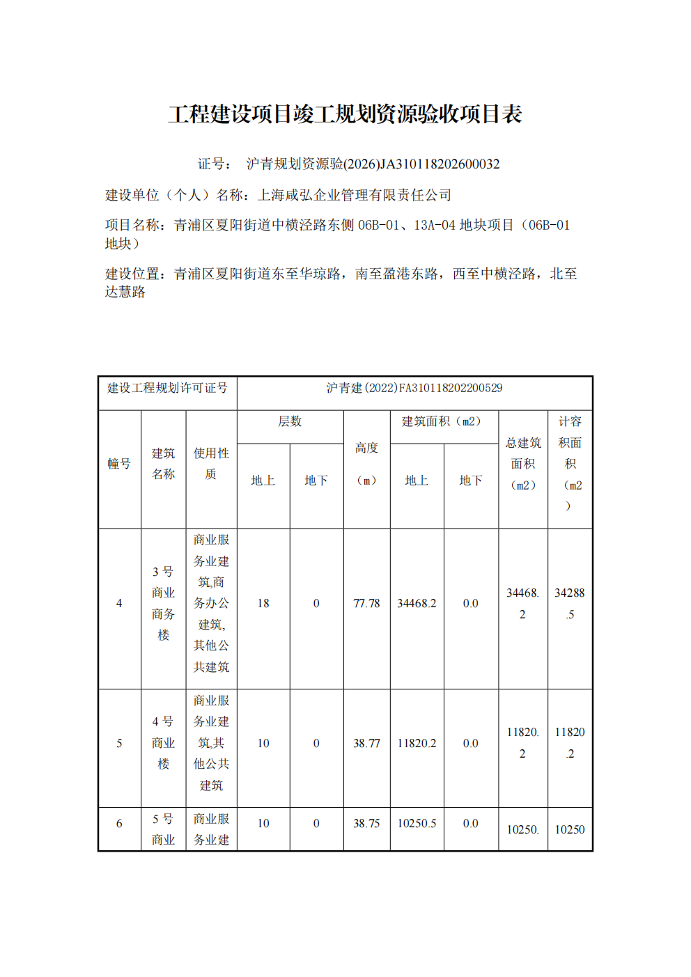 沪青规划资源验 (2026)JA310118202600032上海市工程建设项目竣工规划资源验收合格证(上海咸弘企业管理有限责任公司)