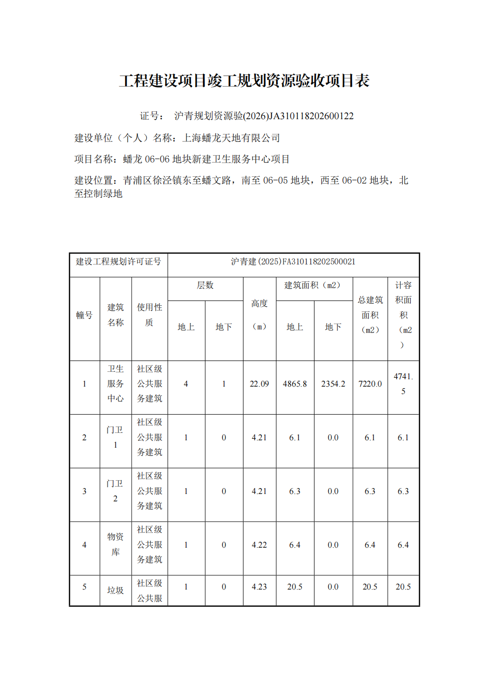 沪青规划资源验 (2026)JA310118202600122上海市工程建设项目竣工规划资源验收合格证(上海蟠龙天地有限公司)