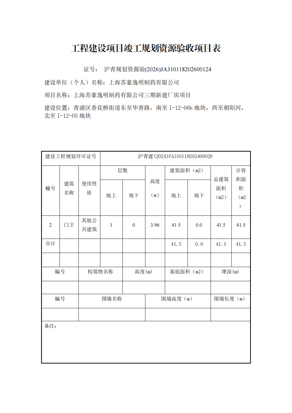 沪青规划资源验 (2026)JA310118202600124上海市工程建设项目竣工规划资源验收合格证(上海苏豪逸明制药有限公司)