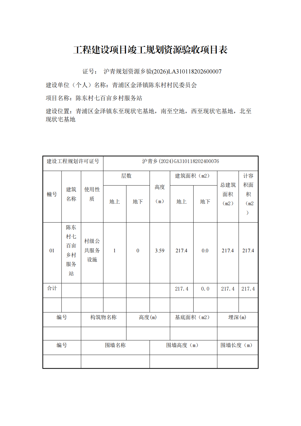 沪青规划资源乡验 (2026)LA310118202600007上海市工程建设项目竣工规划资源验收合格证(上青浦区金泽镇陈东村村民委员会队)
