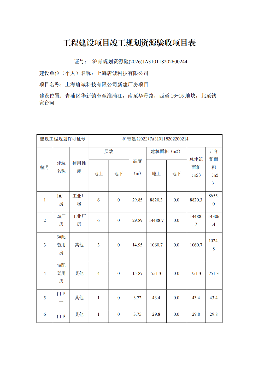 沪青规划资源验 (2026)JA310118202600244上海市工程建设项目竣工规划资源验收合格证(上海唐诚科技有限公司)