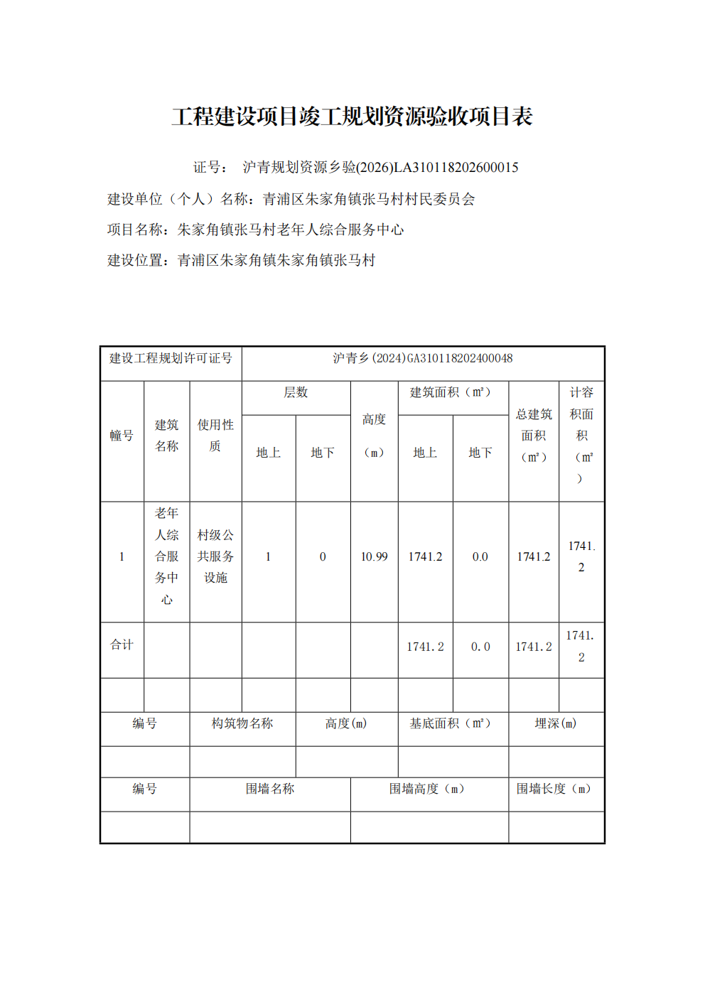 沪青规划资源乡验(2026)LA310118202600015上海市工程建设项目竣工规划资源验收合格证(青浦区朱家角镇张马村村民委员会)