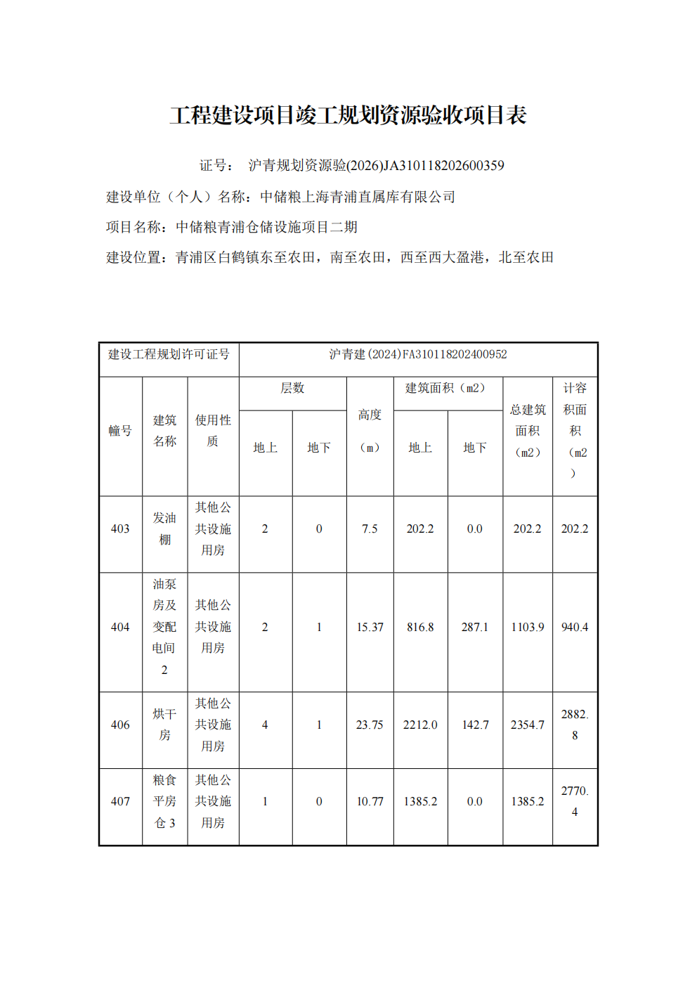 沪青规划资源验(2026)JA310118202600359上海市工程建设项目竣工规划资源验收合格证(中储粮上海青浦直属库有限公司)