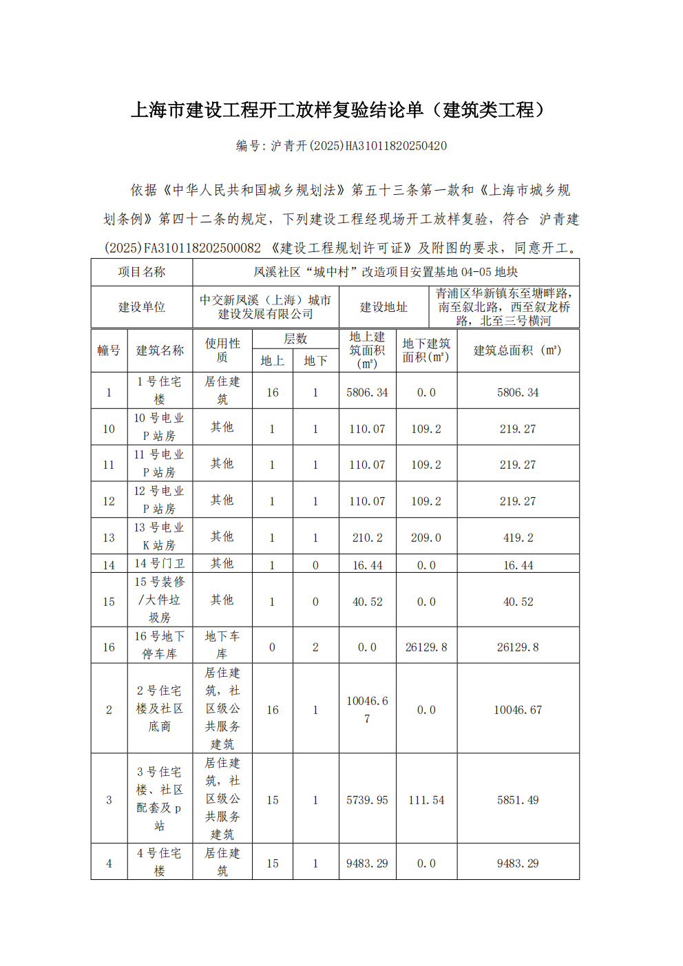 沪青开(2025)HA31011820250420上海市建设工程开工放样复验结论单(中交新凤溪(上海)城市 建设发展有限公司)