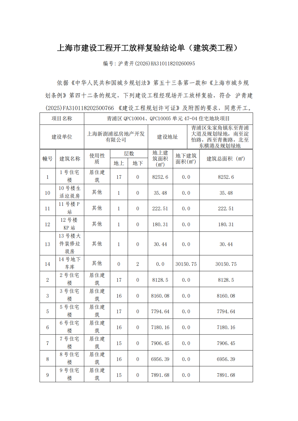 沪青开(2026)HA31011820260095上海市建设工程开工放样复验结论单(上海新澍浦泓房地产开发 有限公司)