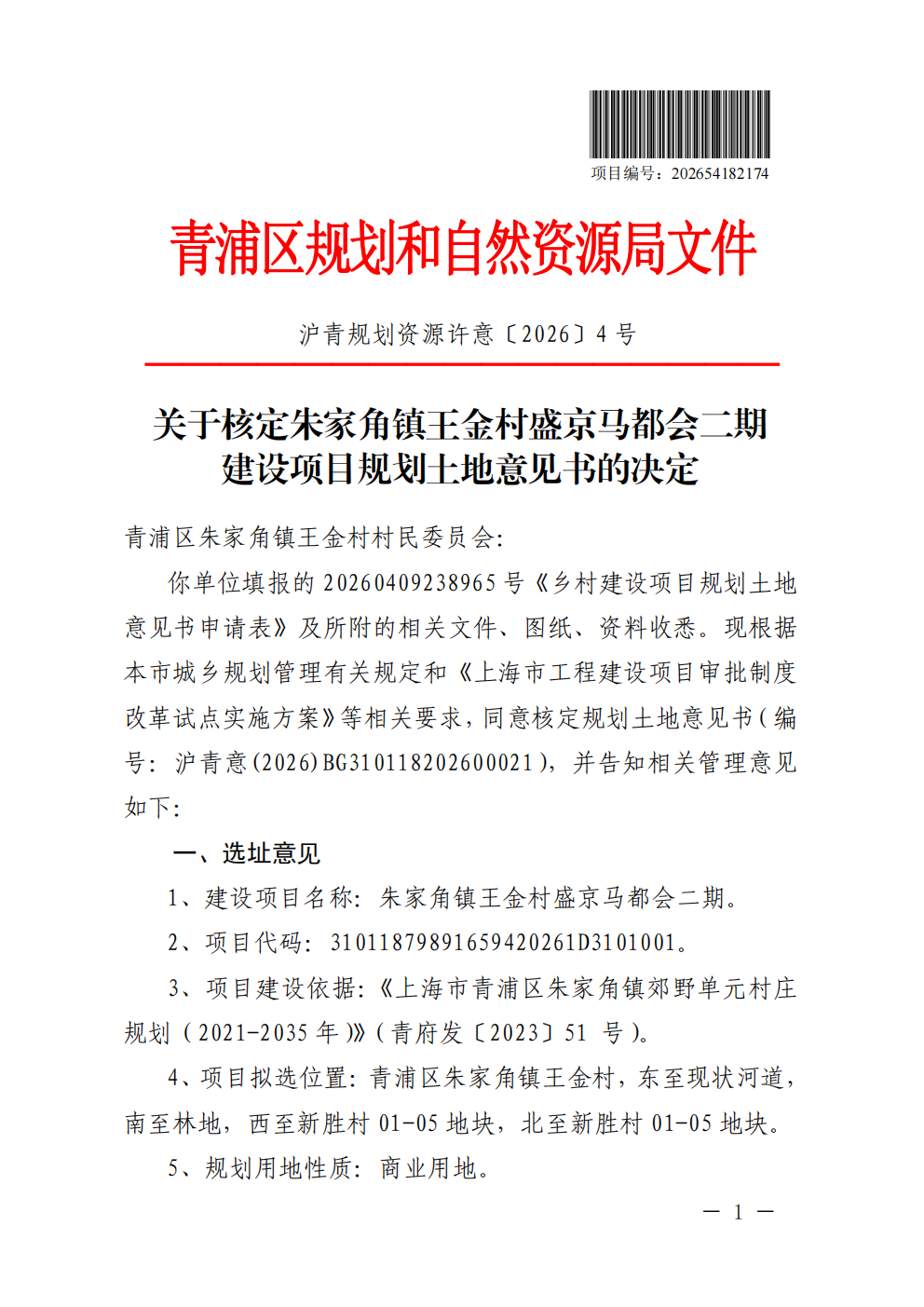 沪青意(2026)BG310118202600021建设项目规划土地意见书公示