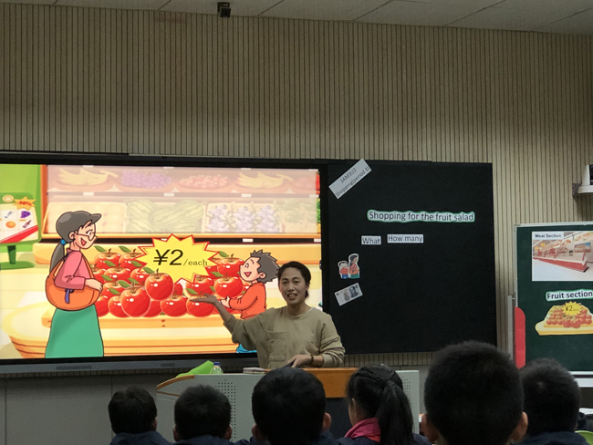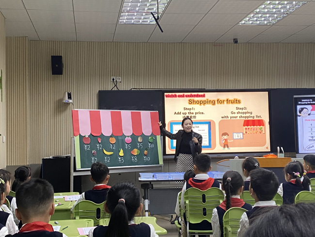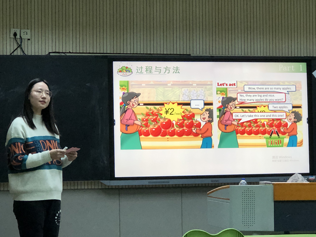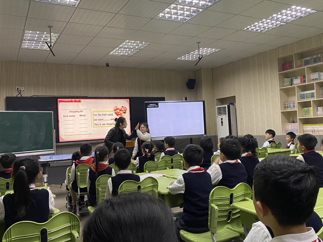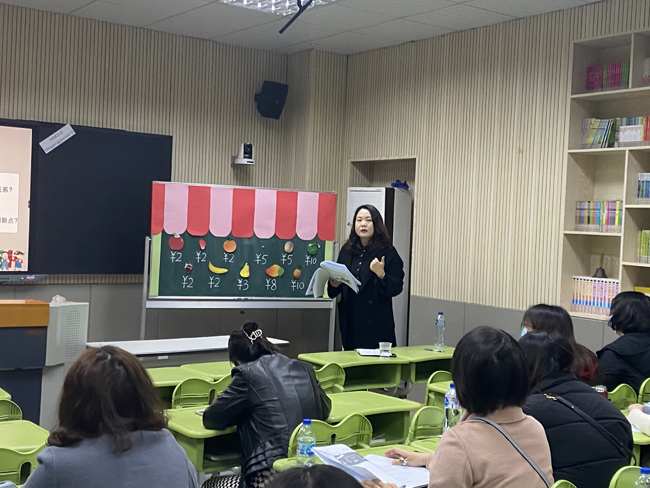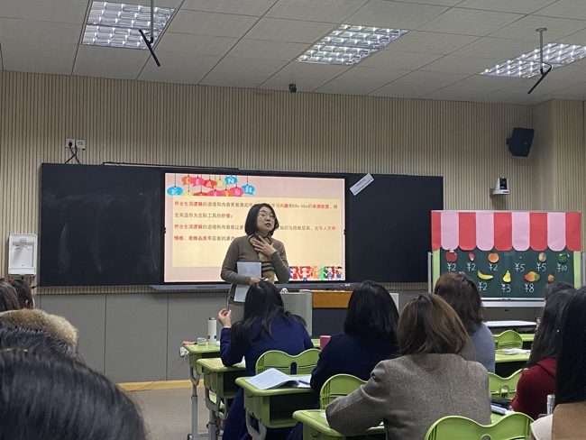 在思考与实践板块,首先,由周根妹老师就本次活动主题进行了阐述,推出了本次教研的主旨,并提出了三个观课视角,引导与会教师带着问题针对性地进行观课。接着,青教院附小朱英蕾老师“从研读教材,确立主题语境;围绕主题,确定单元目标;依据目标,设计单元任务”三方面进行3A M3U2 Shopping单元整体设计说明;毛秀媛老师从“目标和任务、话题和内容、过程和活动、作业和评价”对第1、2课时进行了教学设计说明。青教院附小王茜圆老师为大家展示了第二课时Shopping for fruits的课堂教学。王老师利用多种教学资源,引导学生思考,带领学生在语境中借助购物清单完成了一次购物的体验。之后,嵩华小学的印家佩、陈巧燕老师围绕“目标导向的活动和作业的设计与实施”对第3课时进行了教学设计说明。接着,嵩华小学的张晓琳老师为大家展示了第三课时Shopping for the fruit salad的课堂教学。她通过巧妙的活动设计,引导学生体验购物的乐趣,感受购物要有规划性。最后,实验小学的陆文蕾老师对第4课时进行了教学设计说明。陆老师引导学生在情境中综合运用语言完成购物清单,模拟购物并完成水果色拉的制作,注重培养学生积累生活经验,加深情感体验。