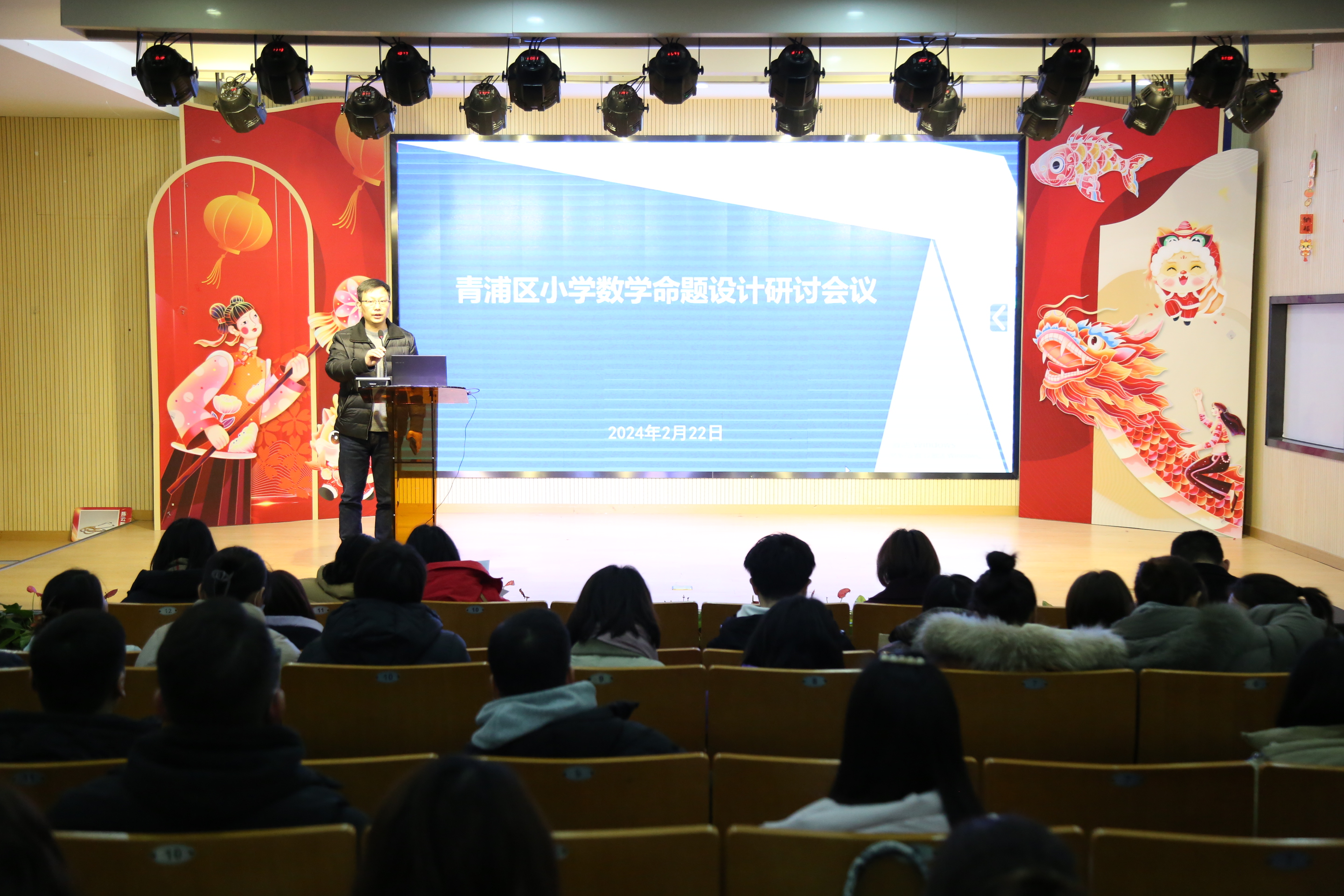 2024年2月22日下午,青浦区小学数学命题设计研讨活动在青教院附小的小剧场里进行,活动由青浦区教师进修学院数学教研员杨爱军老师主持,参加活动的有青浦区数学教研员林源老师、青浦区小学数学学科中心组老师、各小学和九年一贯制学校数学分管,以及青教院附小全体数学老师。