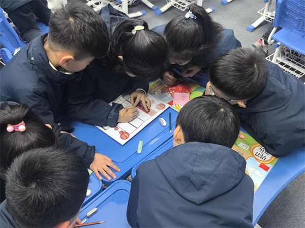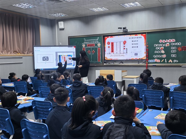 朱琳老师展示教学该项目的第二课时。整堂课以“年俗探秘+展区规划”为核心任务,通过“翻转福字”游戏串联四个年俗,融合生活分享、实践体验、文化解读等系列活动,如贴春联、对比不同年代的年夜饭、学做拱手礼等,让学生在沉浸式体验中领悟“期盼、团圆、祝福”等文化内涵。在项目推进环节,小组合作设计展区草图、互评投票、AI优化,将年俗文化呈现转化为具体创作思路,让学生在自主策划、合作创作、互动展示中锤炼团队协作、创新思维与文化表达能力,为后续展品制作与展台布置奠定基础。