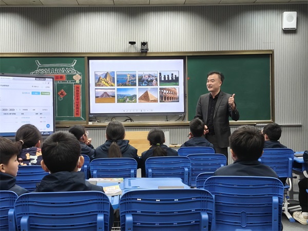 陈强老师执教五年级上册《探访古代文明》的第一课时。本节课活动设计层层递进,由短视频导入,直观呈现世界著名文明遗迹,并以问题链引发思考,揭示课题。随后引导学生解读地图,初识大河流域文明共性;再聚焦中华文明开展“小小考古家”实践活动,利用AI工具深入了解河姆渡人与半坡人在“住、用、食”等方面的特点,并完成“考古报告”,让学生在体验探究、交流思辨中感受远古先民的生存智慧。拓展环节引入AI工具与多元资料,进一步丰富学习形式,拓宽学生视野,使学生认识到世界早期文明的多样性与重要贡献。