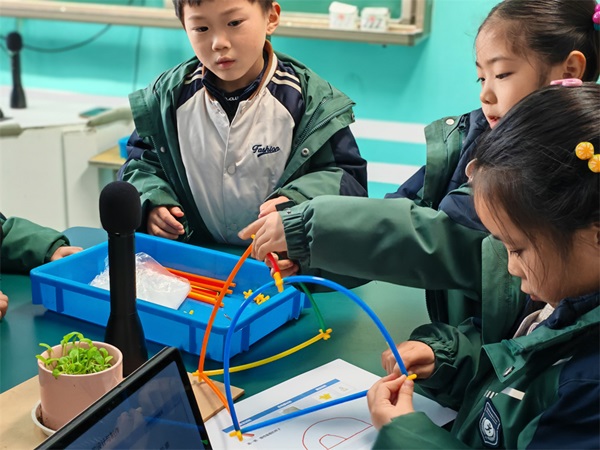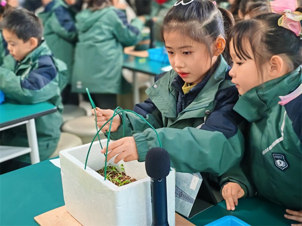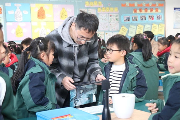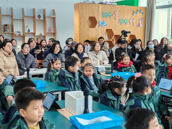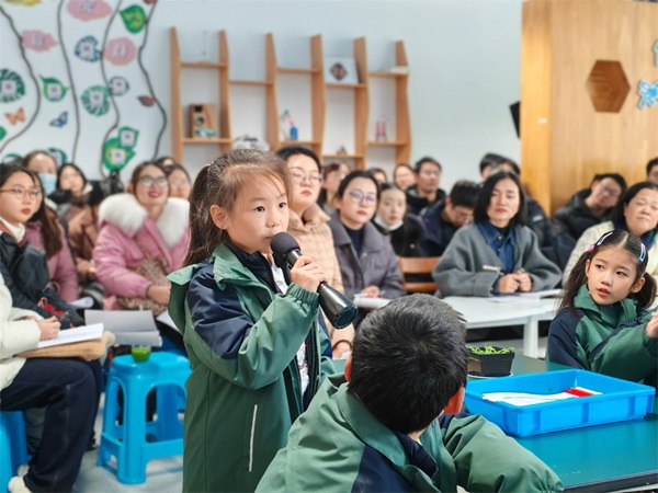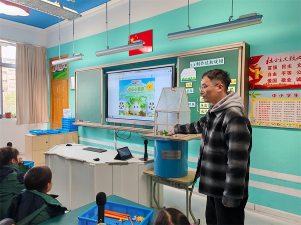 随后,佳禾小学朱磊老师进行了一年级《播撒菜籽观生长,巧手搭棚御寒霜——制作植物暖棚》项目第五课时的教学展示。课堂上,朱老师以真实生活情境为切入点,引导学生完整经历了工程与技术类作业的“设计方案—动手制作—优化改进—成果展示”的项目式学习流程,既践行了“做中学、学中思”的教学理念,又着力培养学生的工程思维与实践能力,生动诠释了项目化学习在科学课堂中的有效应用,为参会教师提供了可借鉴的实践范例。
