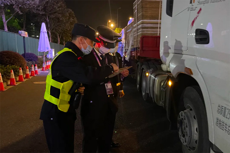 当车辆完成了安全检查之后,民警会安排押送的保安队员上车,并在安保人员和司机上车之后,对车辆的车门进行粘贴封条。在车辆进入国家会展中心管控区域的时候,那边的安保人员会查看封条和车辆情况,当封条完好无损的情况下才允许进入“四叶草”。青浦公安分局第四届进博会安保第八责任区执行负责人王斌告诉记者:“当货车驶出P24远端安检区域,向国家会展中心进发途中都是严格按照我们规定的路线,在这个路线上是全覆盖的视频监控,公安交警部门也会对路线的交通秩序进行保障,实现整个行进过程中数字化可回溯,确保安全!”