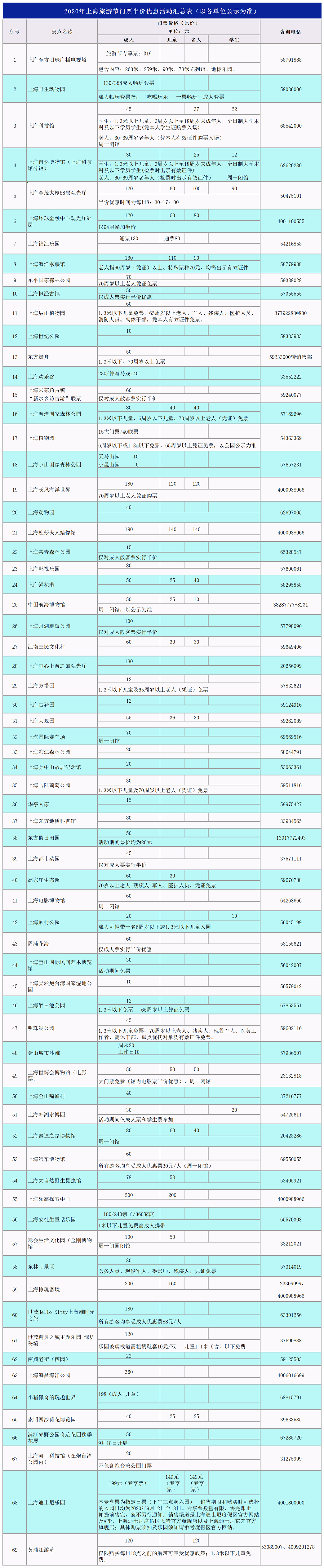 2020年上海旅游节优惠包来啦!2020年上海旅游节推出惠民利民活动,吸引更多市民游客感受城市温度。第一波福利:9月12日-18日,全市69家景区(点)、博物馆推出门票半价优惠,名单详见↓