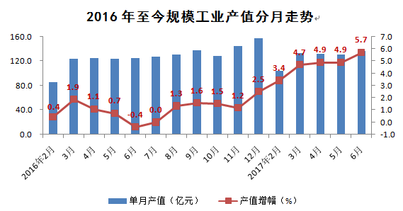 工业生产稳中有升。今年以来,工业生产处于恢复性增长阶段,走势回升明显,对全区经济的支撑作用有所增强。上半年工业实现增加值207.6 亿元,增长3.8%,拉动经济增长1.8个百分点,对经济增长的贡献率为24.5%。上半年规模工业完成产值756.0亿元,同比增长5.7%,增幅环比扩大0.8个百分点。累计实现销售产值754.4亿元,增长5.4%,产销率达99.8%,其中实现出口交货值193.2亿元,增长9.8%。