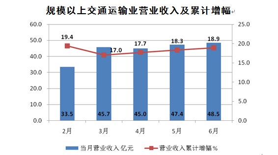 交通运输业增势平稳。上半年全区47家规模以上交通运输业单位共实现营业收入253.7亿元,同比增长18.9%,增幅比上月提升0.6个百分点。其中12家快递服务企业实现营业收入223.6亿元,占总收入的88.1%,增长22.0%。“三通一达”4家企业总部实现营业收入209.4亿元,占比达82.5%,增长22.8%,是带动整个行业平稳快速增长的重要驱动力。