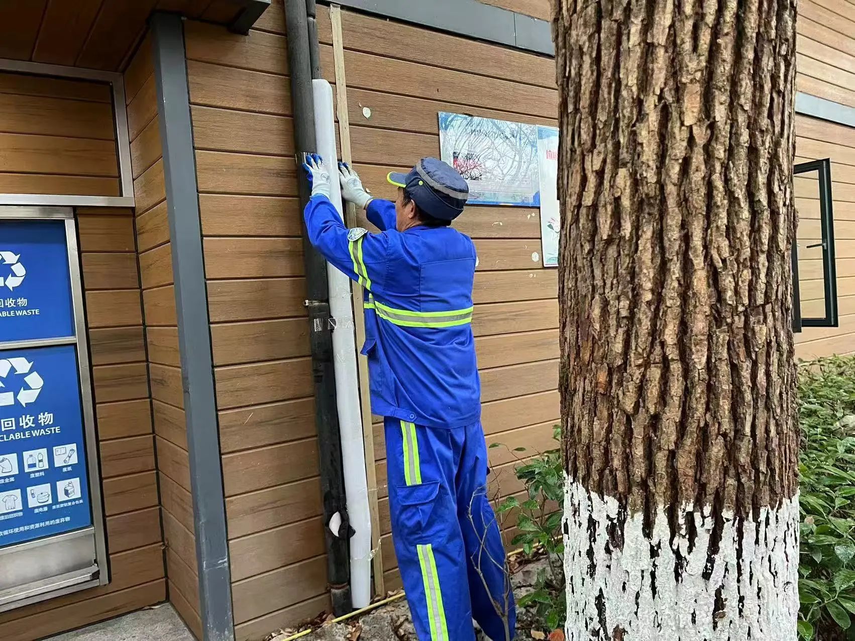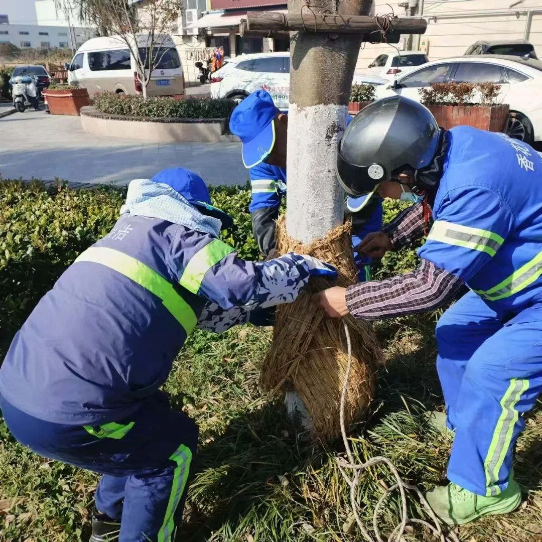 气温低于4摄氏度时,停止室外洒水作业,采用干扫作业方式;做好公厕低气温下防冻防滑工作,备齐备全防滑垫等必要物品,设置防滑警示标志,保持地面干燥,对室外裸露水管进行御寒“包扎”,防止爆裂情况发生;对辖区绿化树木涂白及御寒防护,进一步增强树木御寒和抵抗害虫能力。