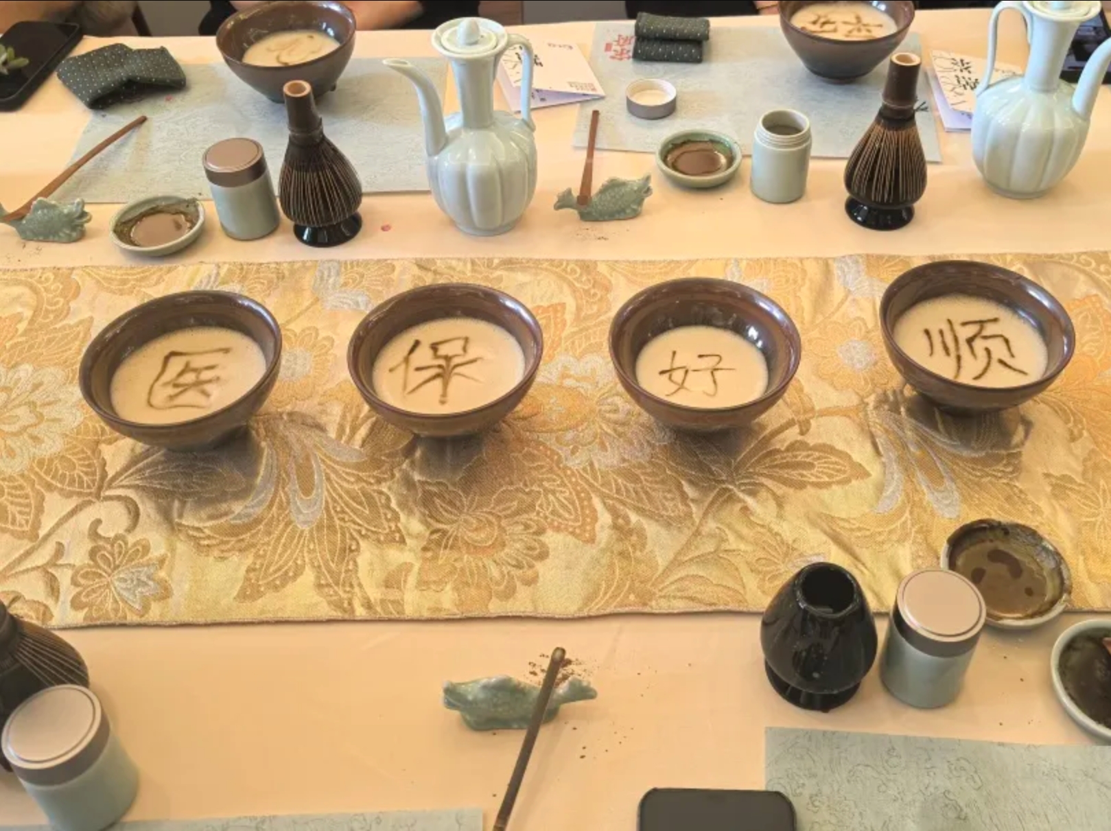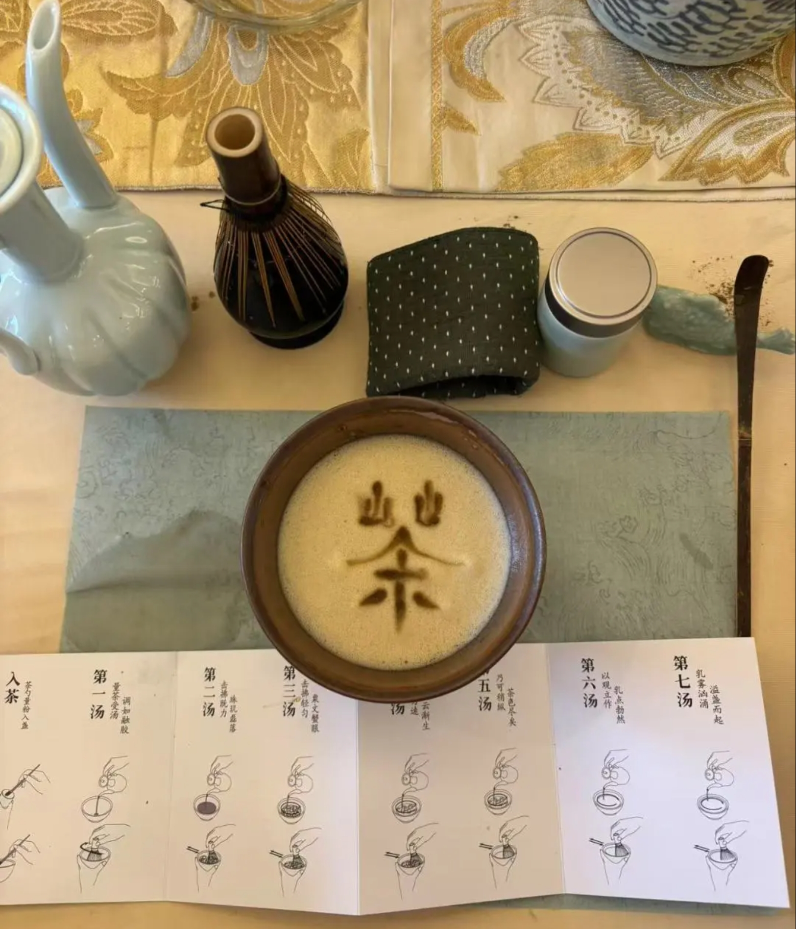 活动现场,茶艺师先以PPT授课的形式,为大家详细介绍了点茶的起源与发展,以及宋代茶文化的特点和烹制方法,让大家对点茶技艺有了初步了解,再向大家示范了点茶的整套流程。随后,大家纷纷亲自体验,从温盏到击拂再到调膏作画,动作如行云流水,充满了仪式感与美感。很快,一盏盏清香四溢的宋式热茶就出炉了。大家沉浸在杯盏间的清幽意境中,感受着内心的宁静平和。